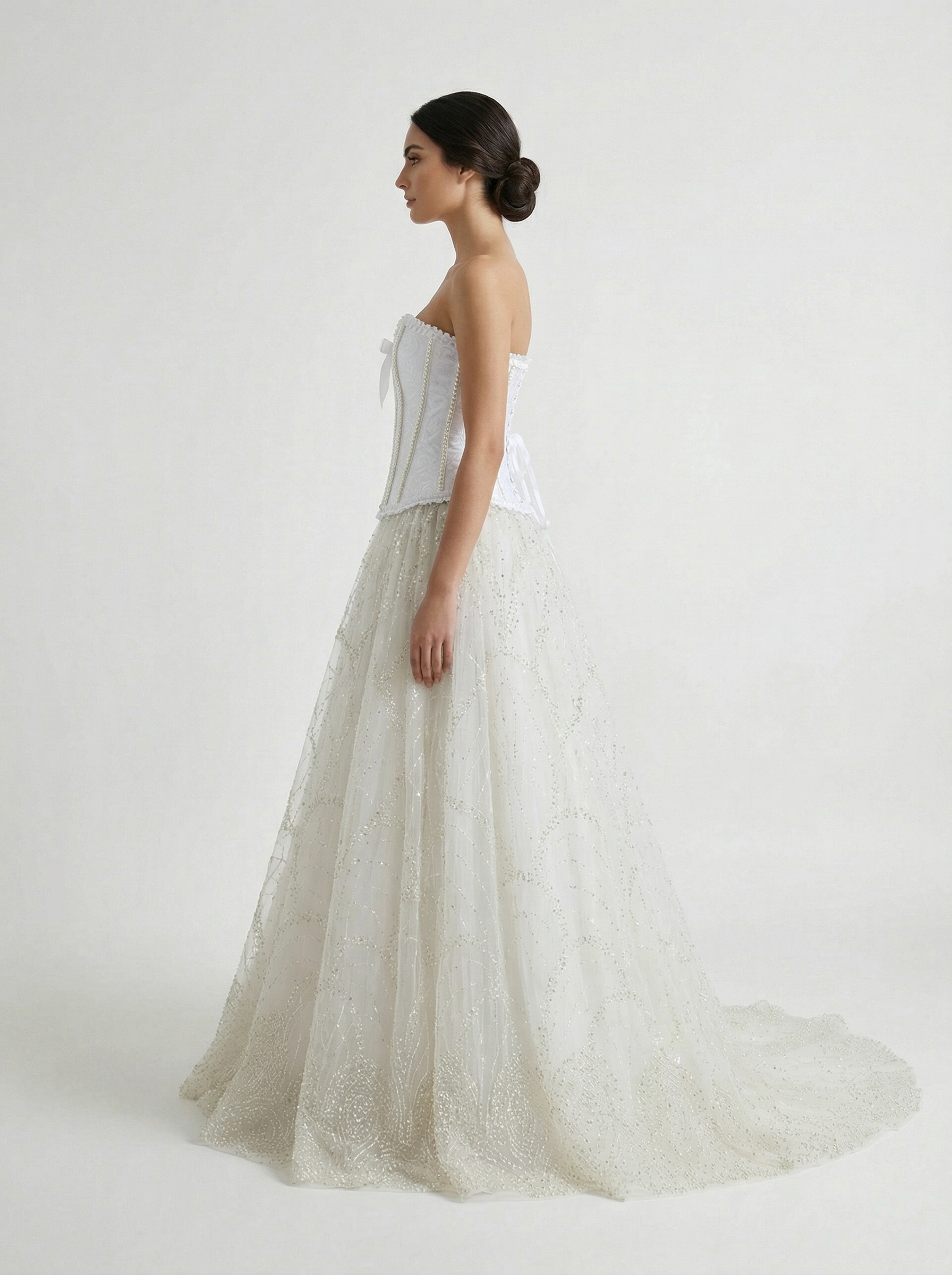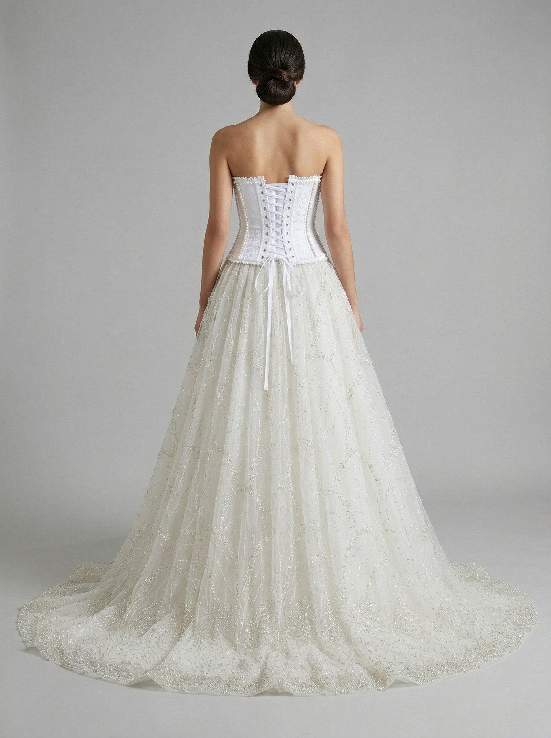 For styling, we recommend pairing this voluminous gown with stiletto heels to add height and balance the skirt’s fullness. Keep accessories elegant—think diamond drop earrings or a delicate tennis bracelet—to let the silhouette of the dress remain the focal point. For hair, a sleek updo or soft Hollywood waves work beautifully with the corset neckline.