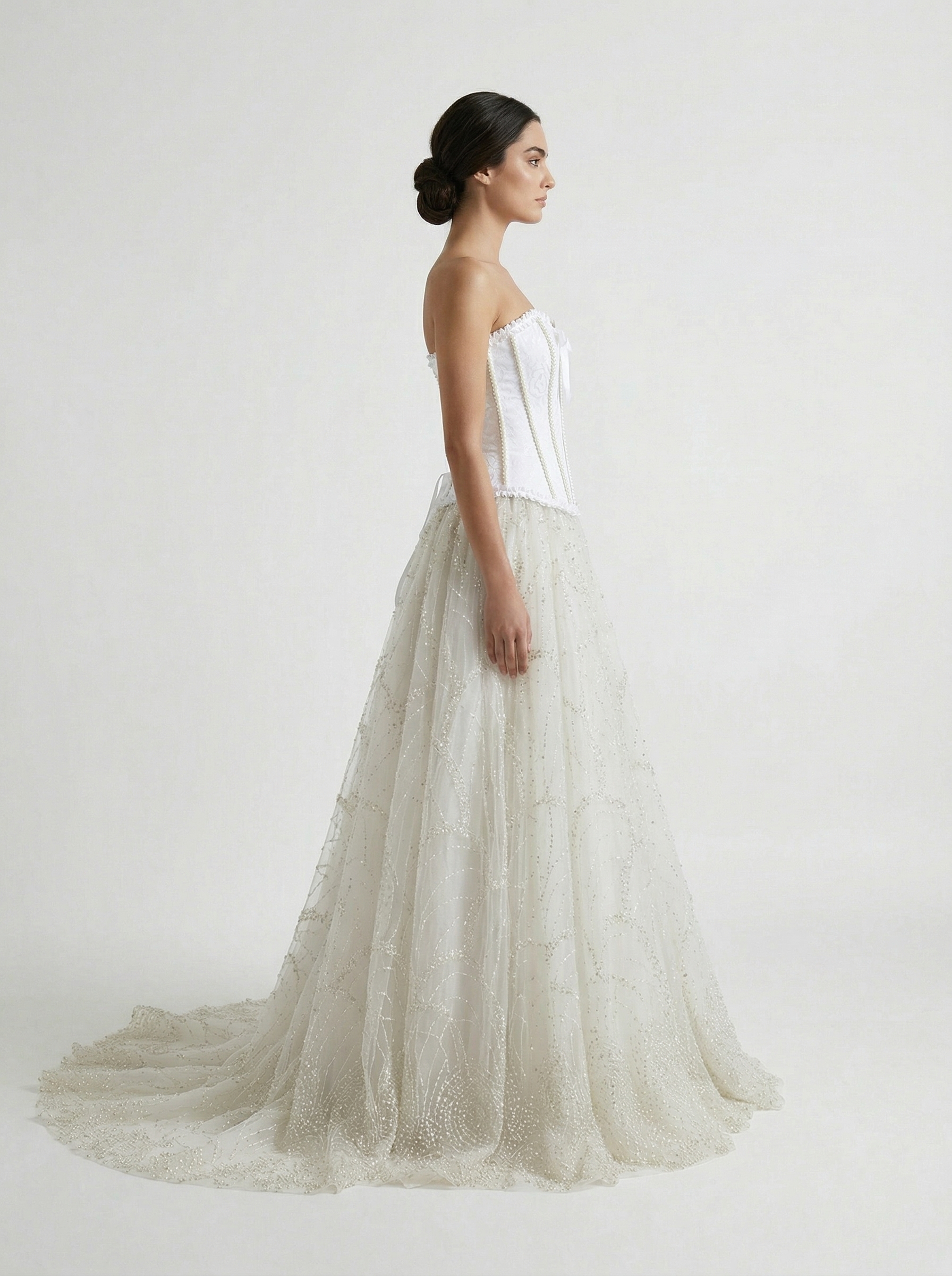 Care Instructions: To maintain the volume of the tulle and the structure of the corset, we recommend professional dry cleaning only. Store in a garment bag to avoid snagging the delicate mesh layers.