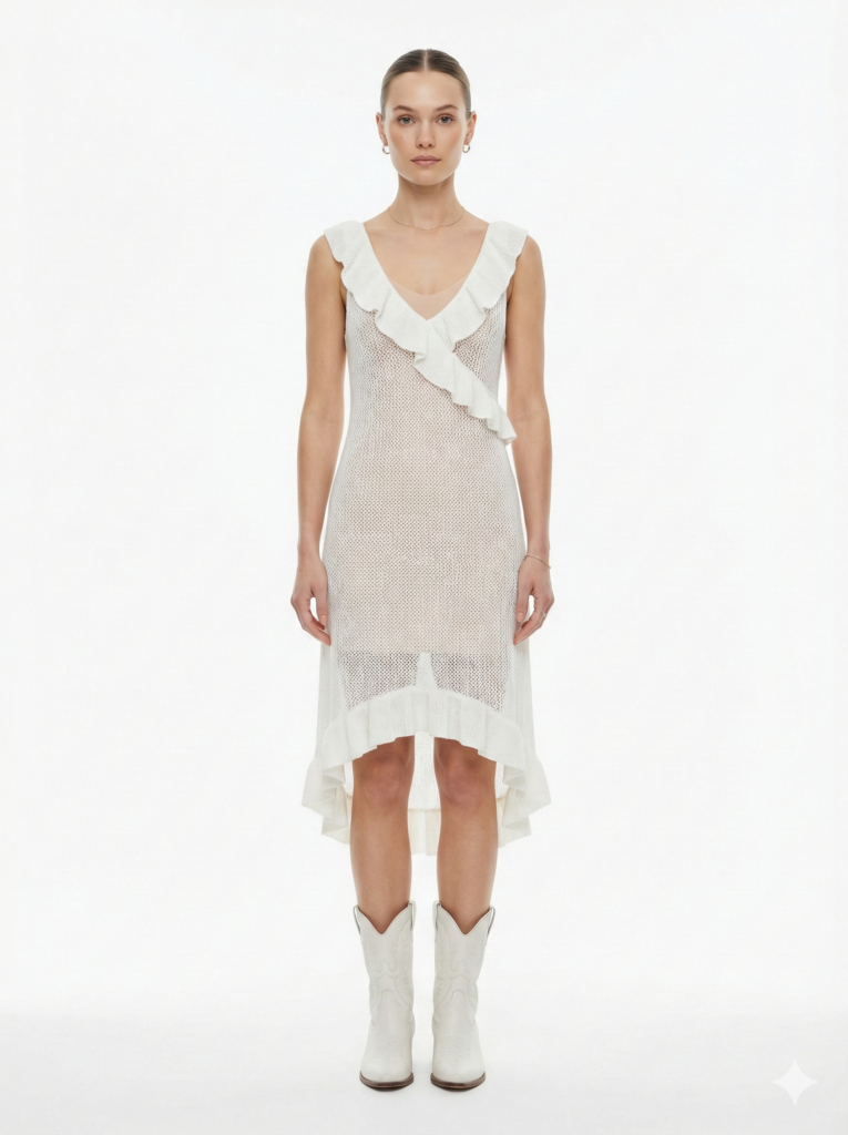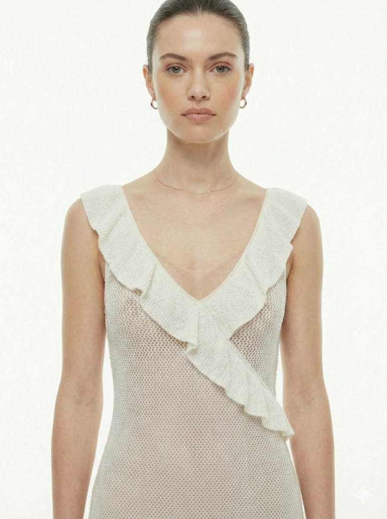 Ruffled White Semi Sheer Knitted Dress
