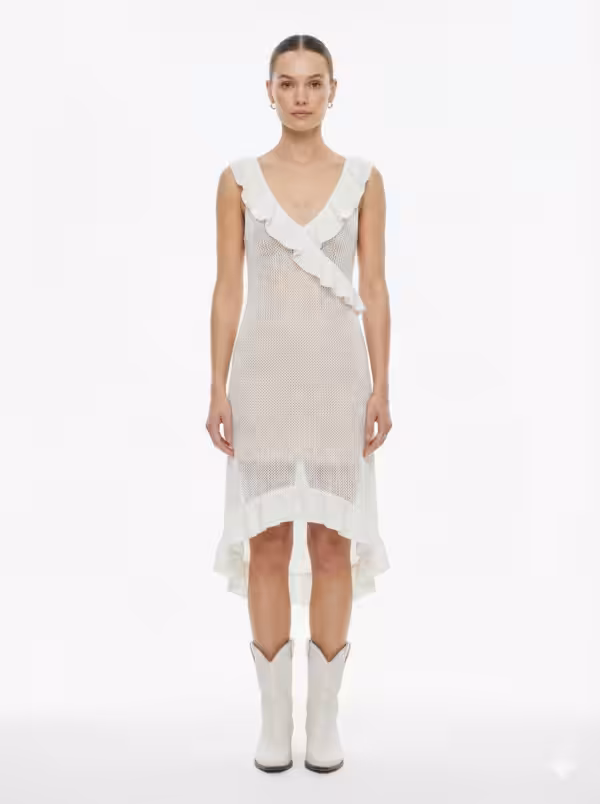 Ruffled White Semi Sheer Knitted Dress